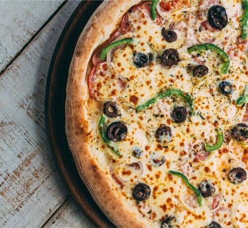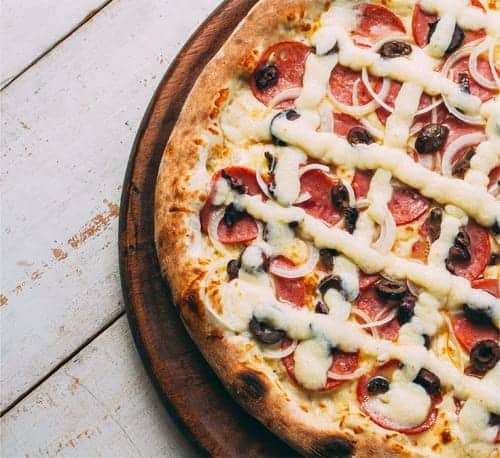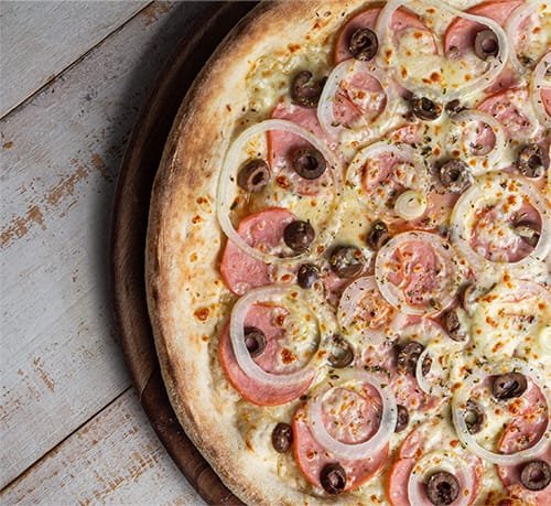 Molho de tomate, muçarela, calabresa, cebola, azeitona e requeijão.
