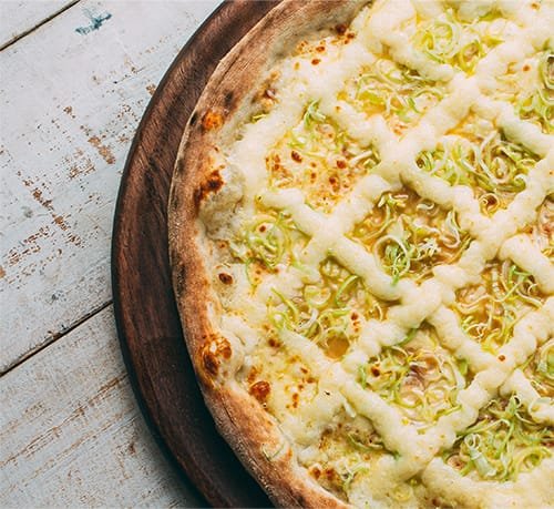 Molho de tomate, muçarela, alho-poró, requeijão.