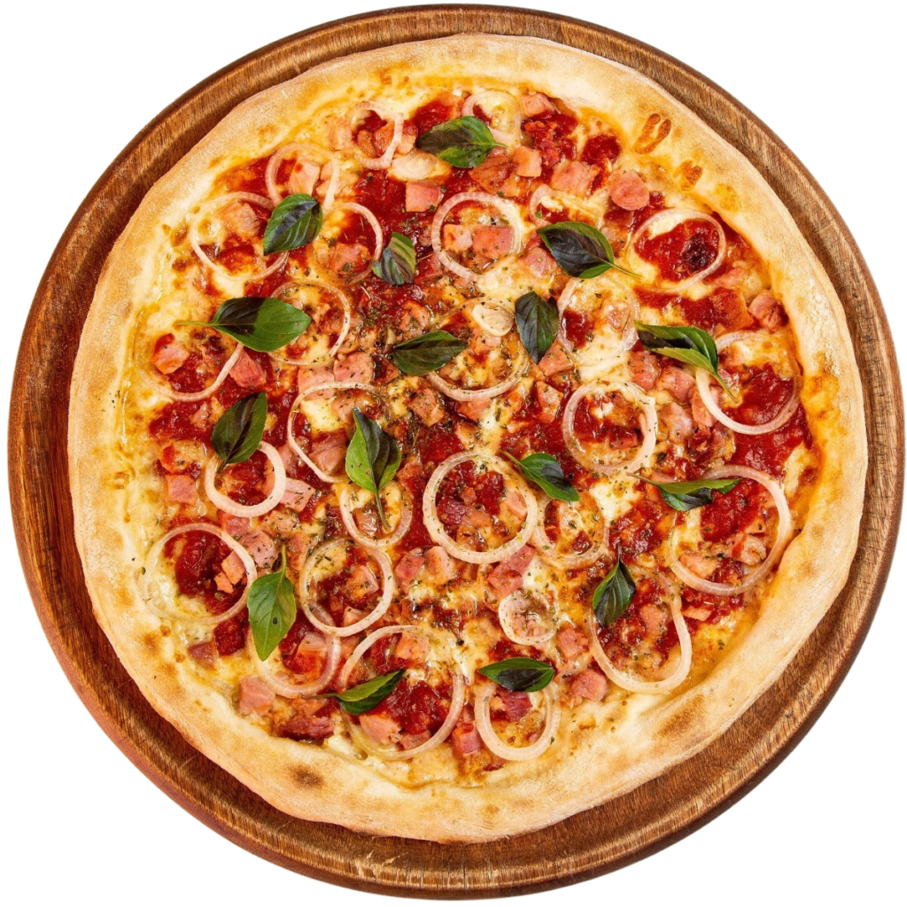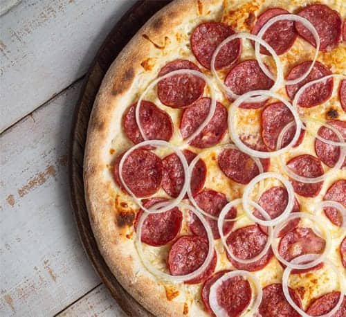Molho de tomate, muçarela, calabresa, pepperoni, bacon e cebola.