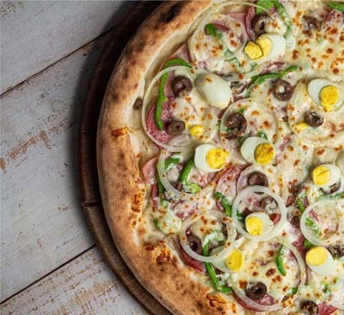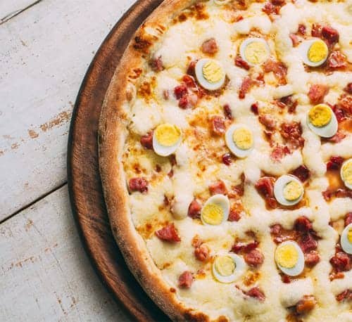 Molho de tomate, muçarela, bacon, requeijão e ovos.