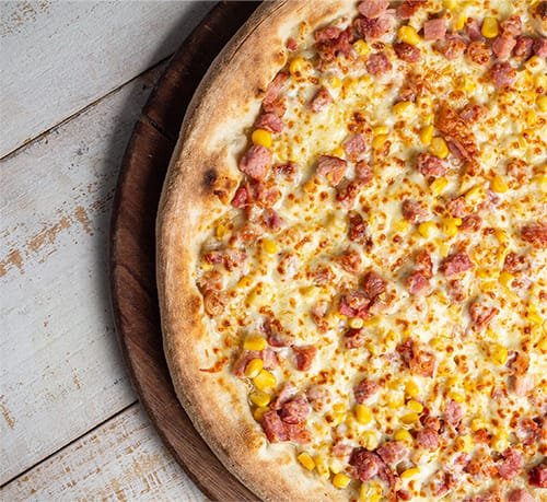 Molho de tomate, muçarela, lombo canadense, milho verde, requeijão, orégano.