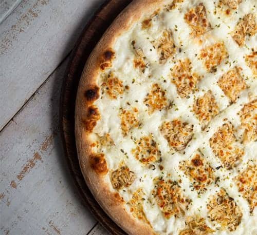 Molho de tomate, muçarela, frango desfiado, bacon e milho verde.