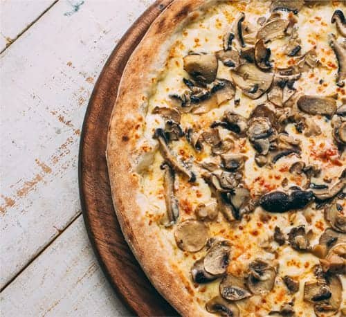 Molho de tomate, muçarela, cogumelo de paris, shitake e shimeji salteados na manteiga e no vinho branco.