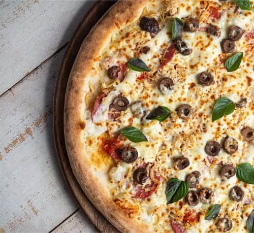 Molho de tomate, muçarela, presunto, calabresa, pepperoni, frango desfiado, azeitona preta e manjericão.