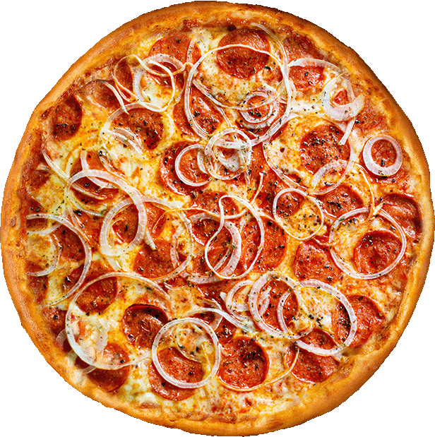 Molho de tomate, muçarela, pepperoni, cebola, orégano.